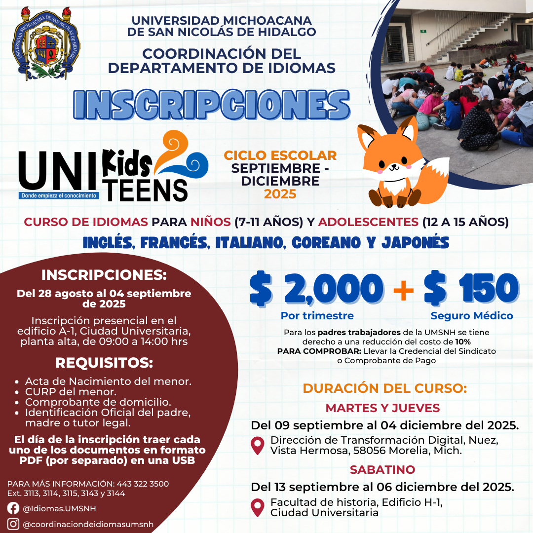 La Universidad Michoacana de San Nicolás de Hidalgo, en la búsqueda de ampliar sus servicios y contribuir a su entorno, oferta los nuevos programas educativos UniKids y UniTeens, mismos que se impartirán, en colaboración, por la Coordinación del Departamento de Idiomas (CDI) y la Dirección de Transformación Digital (DTD). A través de ellos, la universidad busca: incentivar el interés de los individuos más jóvenes de nuestra sociedad por el aprendizaje de lenguas extranjeras, ofertando cursos de diferentes idiomas con nuevas tecnologías, material pedagógico adecuado y equipo enfocado en niños; y, promover los valores éticos, fomentando su formación integral y el humanismo que caracteriza a la Casa de Hidalgo.